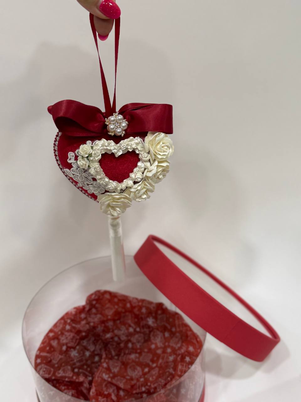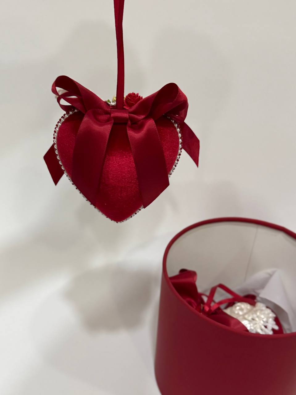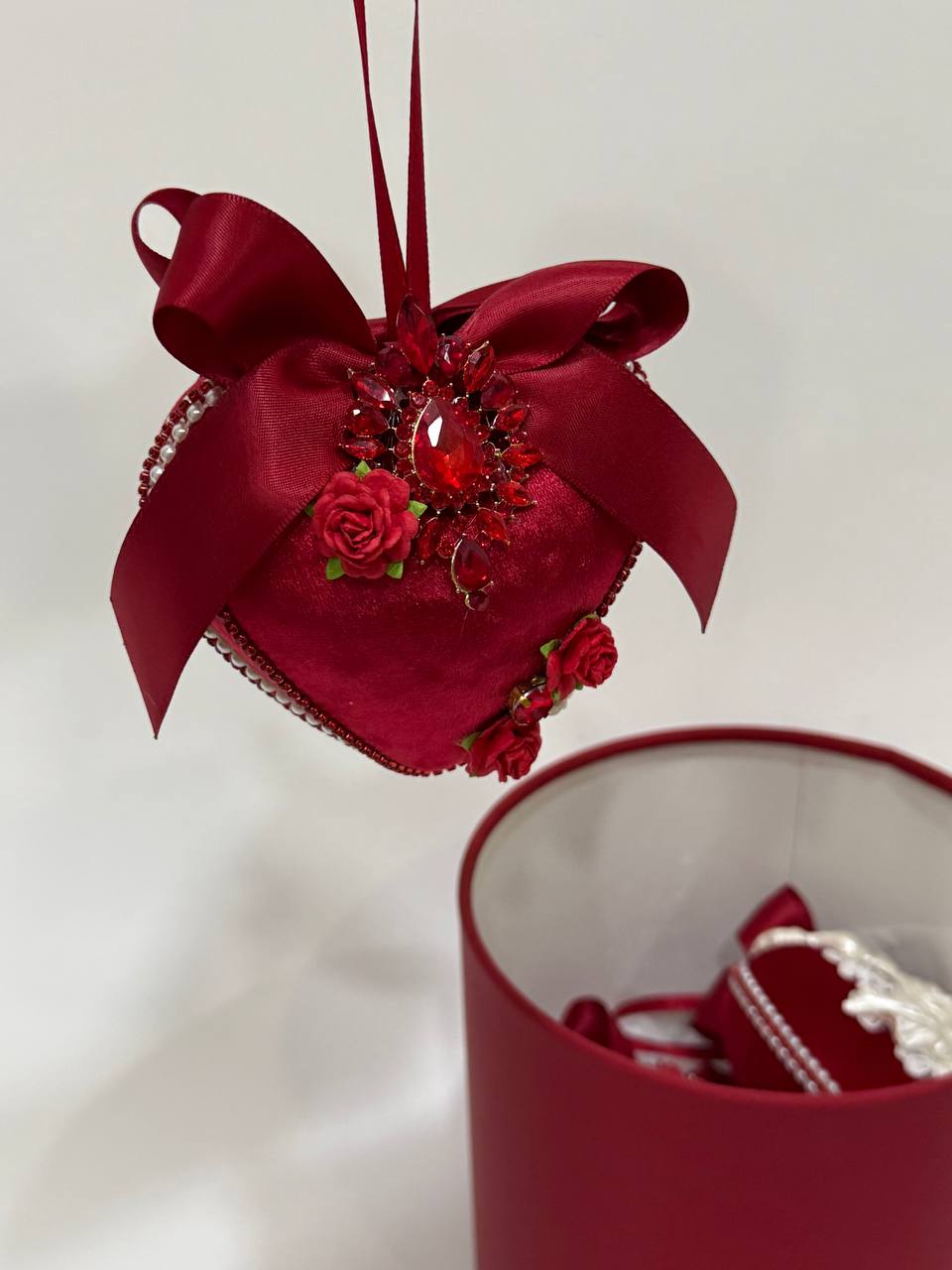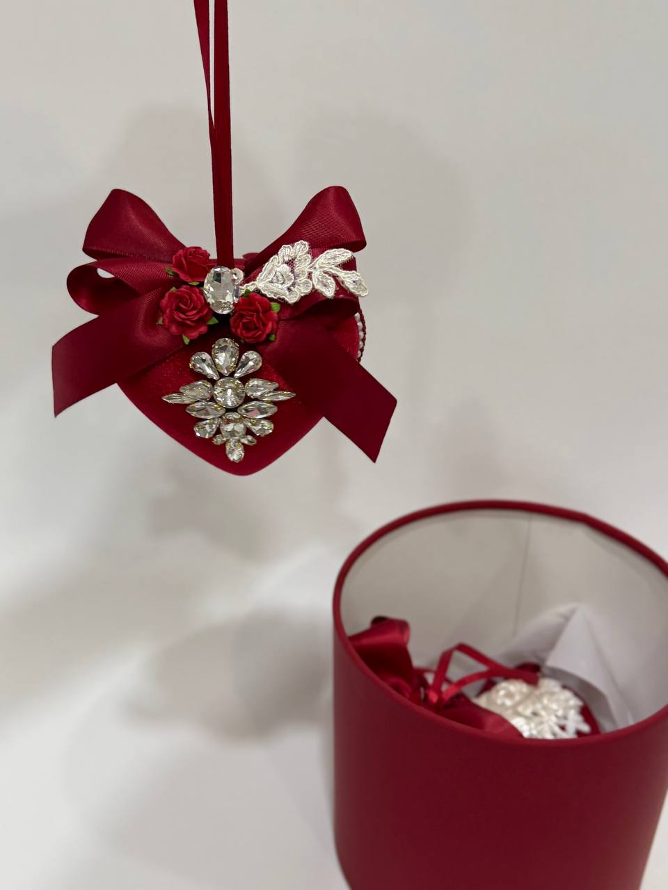 Бархатные сердца, созданные для интерьеров, где важны детали. Мягкий блеск, глубокий винный оттенок и изящный декор превращают обычное пространство в атмосферу праздника и близости. Сердца легко размещаются в интерьере — лента и аккуратное крепление позволяют повесить их на стену, дверь или оконный проём без сложного монтажа. Композиция из нескольких сердец выглядит особенно эффектно и завершённо. Это не просто украшение. Это настроение Дня Святого Валентина, которое остаётся с вами дольше одного вечера.